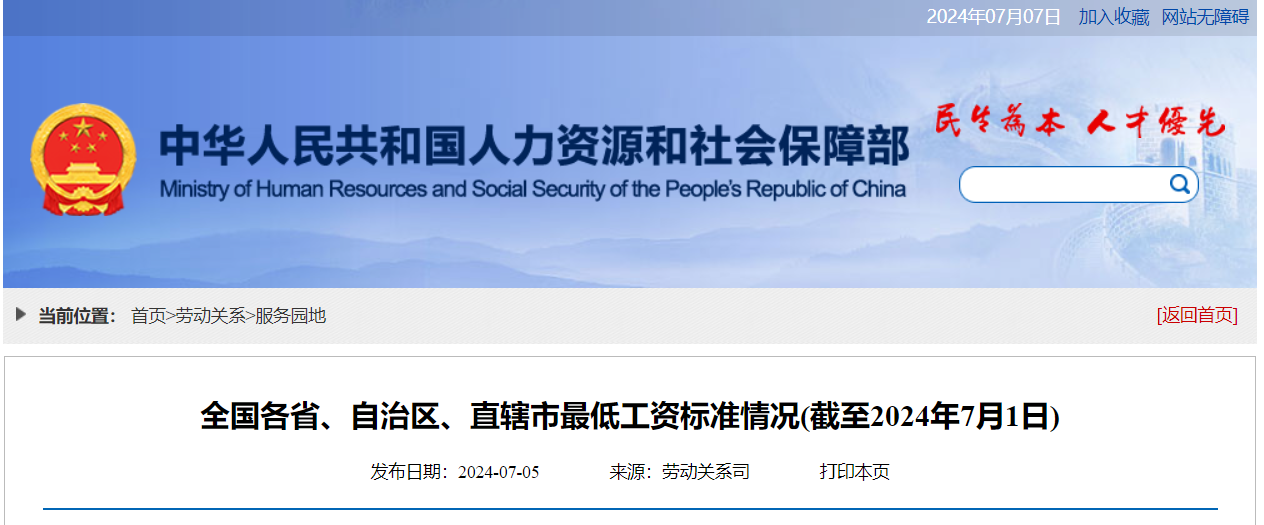 全国各省、自治区、直辖市最低工资标准情况(截至2024年7月1日)